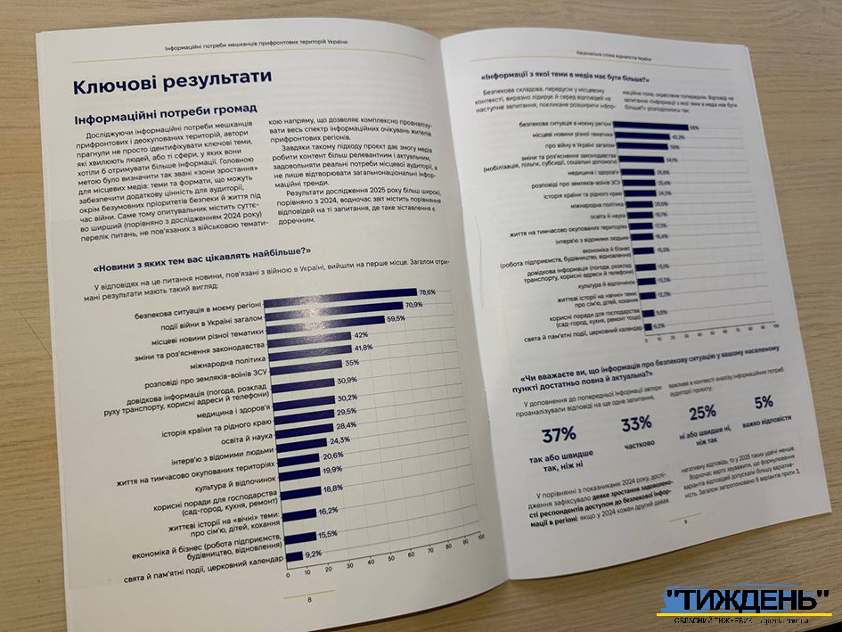 Коли людей запитали, які новини їх цікавлять найбільше, відповідь була однозначною. Майже 79% респондентів назвали безпекову ситуацію у власному регіоні найважливішою темою. Ще 71% цікавляться подіями війни в Україні загалом. Місцеві новини різної тематики цікавлять 60% опитаних.