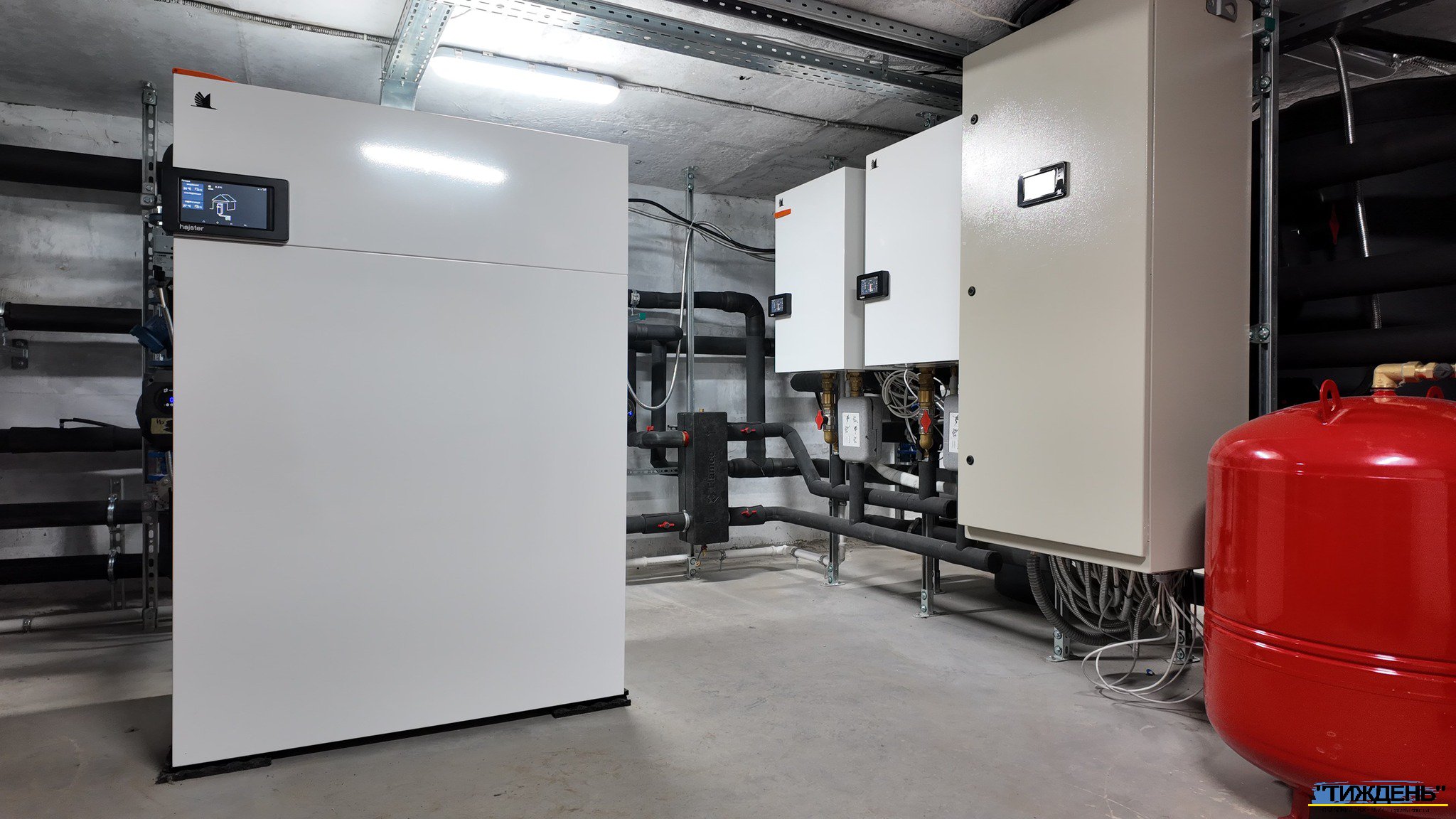 «Система базується на геотермальному тепловому насосі Hajster потужністю 70 кВт та двох повітряних теплових насосах із сумарною потужністю 38 кВт, також розміщені інформаційні табло з датчиками та центральна шафа управління. Нагрів гарячої води відбувається на проточній станції, виконаної з нержавіючої сталі, тобто все гігієнічно і ефективно. В одних буферних ємкостях концентрується гаряча вода для водопостачання, в інших – для опалення будинку. Повітряні теплові насоси працюють до температури +5 градусів С, а далі підключається геотермальний тепловий насос, який доводить температуру на подачі до +80 градусів. І як наслідок, мешканці будинку мають найвищу ефективність від такого рішення. Важливо, що усе обладнання виробляється в Україні», - розповів Сергій Данилов.